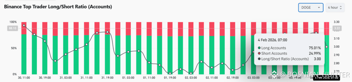 Derivatives positioning revealed aggressive optimism among Binance's top traders. Long Accounts rose to about 75%, while the Long/Short Ratio climbed near 3.0.