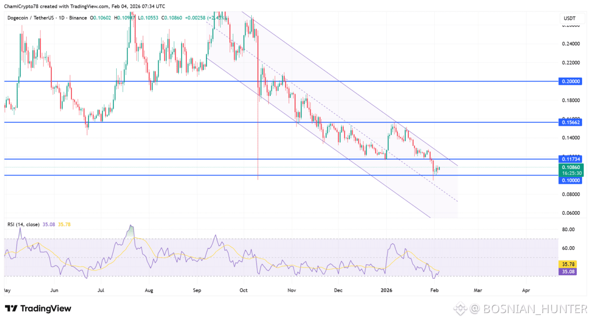DOGE remained stuck inside a descending channel, with lower highs controlling the trend since late 2025.