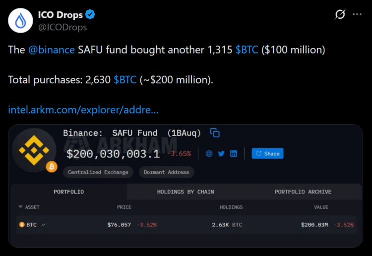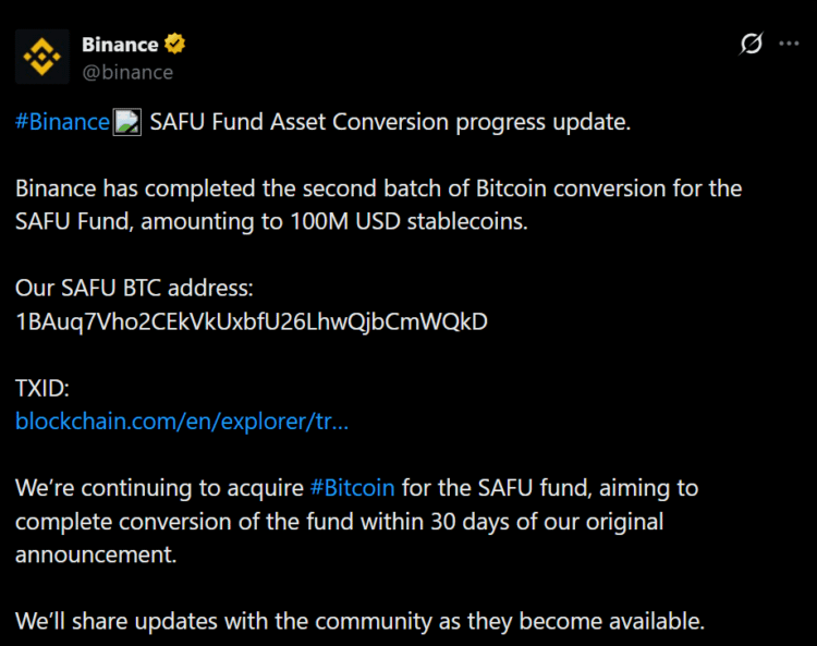 Binance a finalizat a doua fază a conversiei sale de Bitcoin pentru Fondul de Active Securizate pentru Utilizatori, adăugând încă 100 de milioane de dolari în BTC la rezervă. Schimbul a confirmat public tranzacția prin intermediul contului său oficial X, împărtășind atât adresa portofelului, cât și ID-ul tranzacției pentru a permite verificarea pe blockchain. Această transparență semnalizează că nu este o mișcare simbolică, ci una operațională.