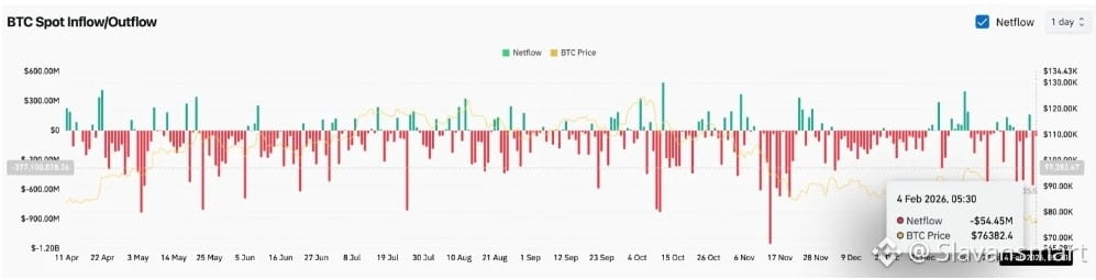 Данные Coinglass показывают 54,45 миллиона долларов в спотовом оттоке на 4 февраля, продолжая схему распределения, определившую последние две недели. Давление на продажи со стороны спотовых рынков подтверждает, что держатели сокращают экспозицию, а не накапливают на более низких уровнях.