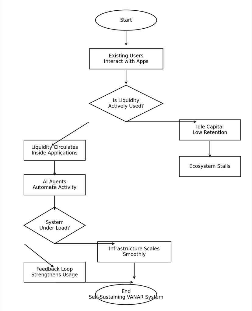 The flow-chart logic also highlights something VANAR avoids. It avoids single points of failure. If one application slows down, others continue. If one liquidity stream weakens, others compensate. If one agent strategy fails, others adapt. This redundancy is not accidental. It is a consequence of building where multiple forms of activity already coexist.