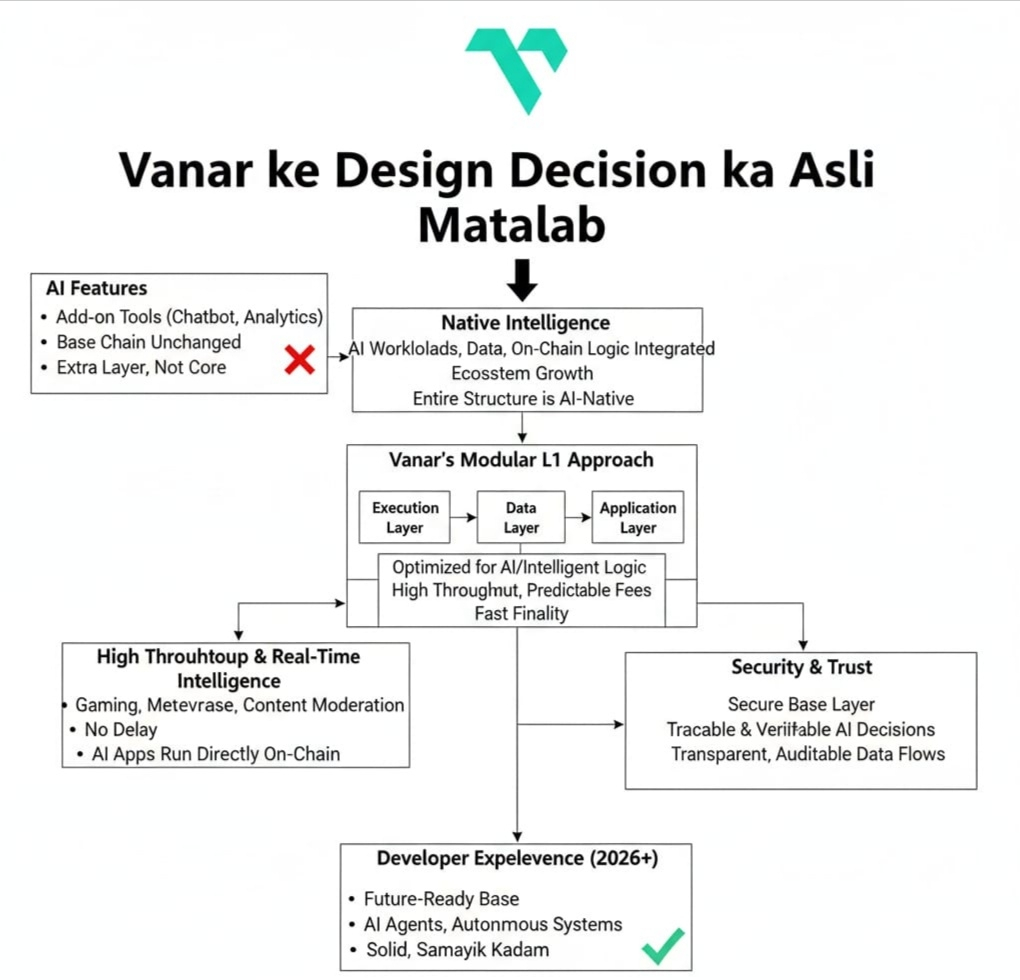 Aajkal blockchain mein “AI-powered” sunte hi sab alert ho jaate hain. Har naya project AI ka label chipka raha hai kabhi chatbot, kabhi analytics dashboard, kabhi automation tool. Lekin Vanar ki thinking bilkul alag hai. Vanar sirf AI ke kuch features add kar ke khush nahi hota, ye AI ko seedhe chain ke core mein, bilkul native tareeke se integrate karta hai. Ye difference samajhna zaroori hai, kyonki yahin se pata chalta hai ki koi chain kitni scalable, secure, aur future-ready hai.