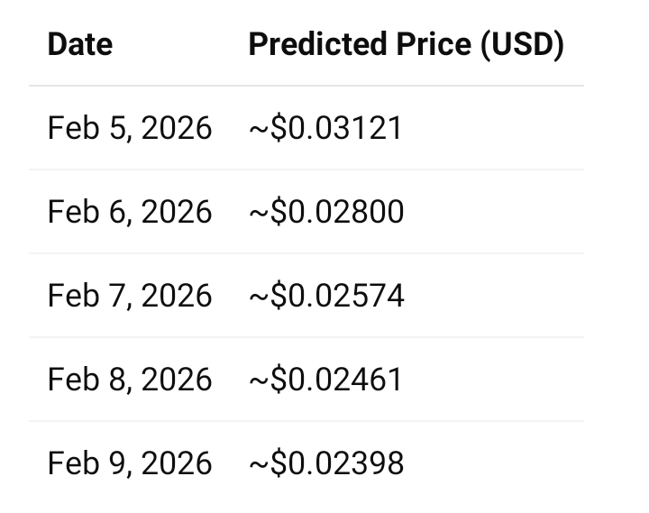 • ~$0.0312 → $0.0246 → $0.0240 până pe 9 feb (aproximativ −20% până la −24% de la nivelurile recente).