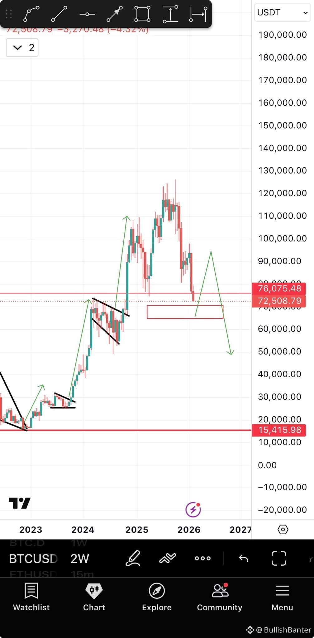 Va fi un minim între 68-72 mii, care va determina sfârșitul corecției undei A de la cel mai înalt nivel istoric al său, care este 125 mii.