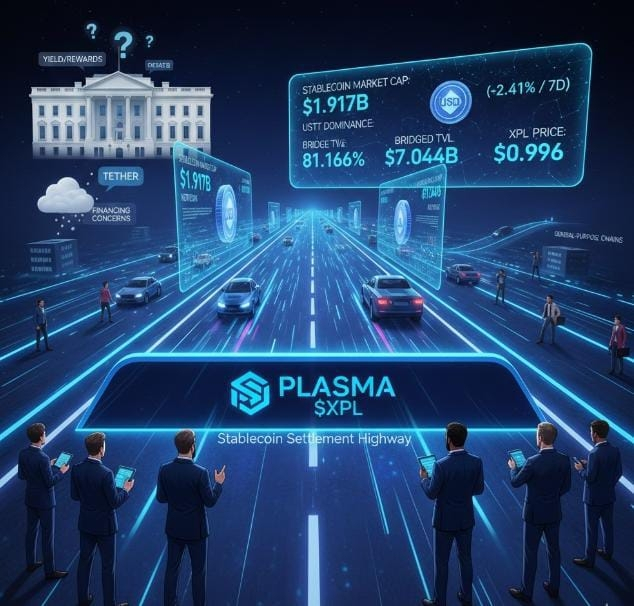 Stablecoin market cap sits at approximately 1.917 billion dollars up 2.41 percent over seven days. USDT dominates with 81.16 percent share. Bridged TVL reaches about 7.044 billion dollars split between native 4.822 billion and third-party 2.223 billion. Seven-day DEX volume hits 127.89 million dollars with a weekly increase of 117.67 percent. While percentage jumps look big on small bases the absolute numbers and direction signal real usage not just noise. XPL trades near 0.096 dollars market cap around 206.22 million FDV near 956.7 million.