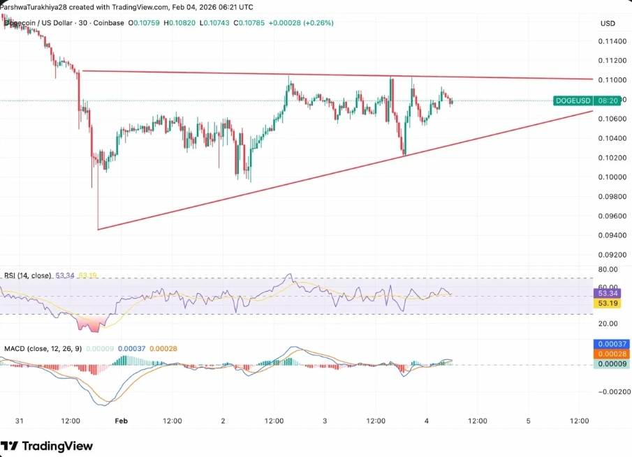 На 30-минутном графике👆Dogecoin сформировал симметричный треугольник по мере консолидации цены после обвала. Паттерн показывает сходящиеся линии тренда с сопротивлением ~ 0.110💲и поддержкой ~ 0.106💲.