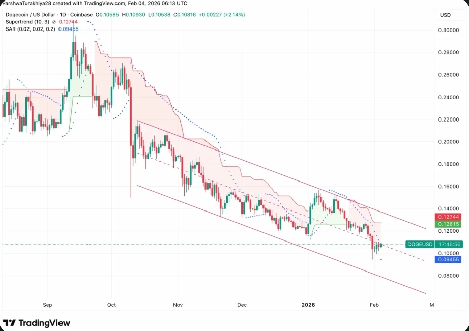 На дневном графике👆Dogecoin торгуется в чётко определённом нисходящем канале, который с сентября 2025 года сохраняет ценовое движение. Сопротивление канала достигает до 0.20💲, а поддержка находится ~ 0.08💲.