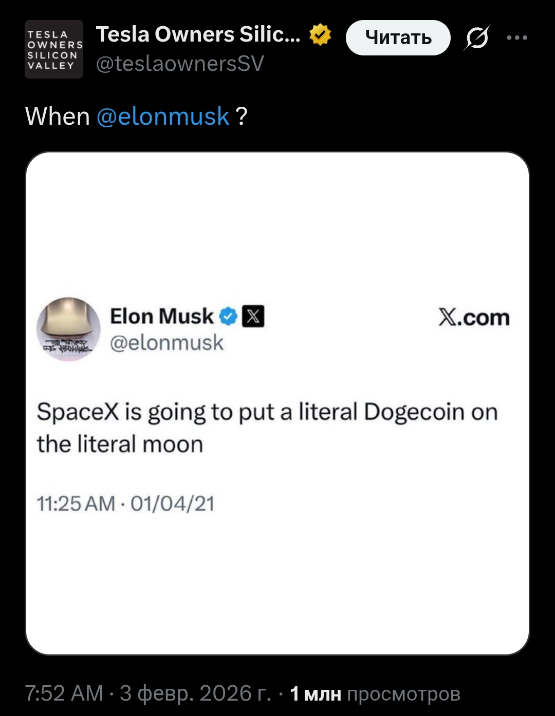 Илон Маск возобновил спекуляции о отправке физического Dogecoin на Луну 3 февраля, ответив "возможно в следующем году" на упоминание о давно отложенной миссии DOGE-1. В комментарии он ссылался на широко разрекламированное обещание 2021 года разместить буквально Dogecoin на буквально Луне.