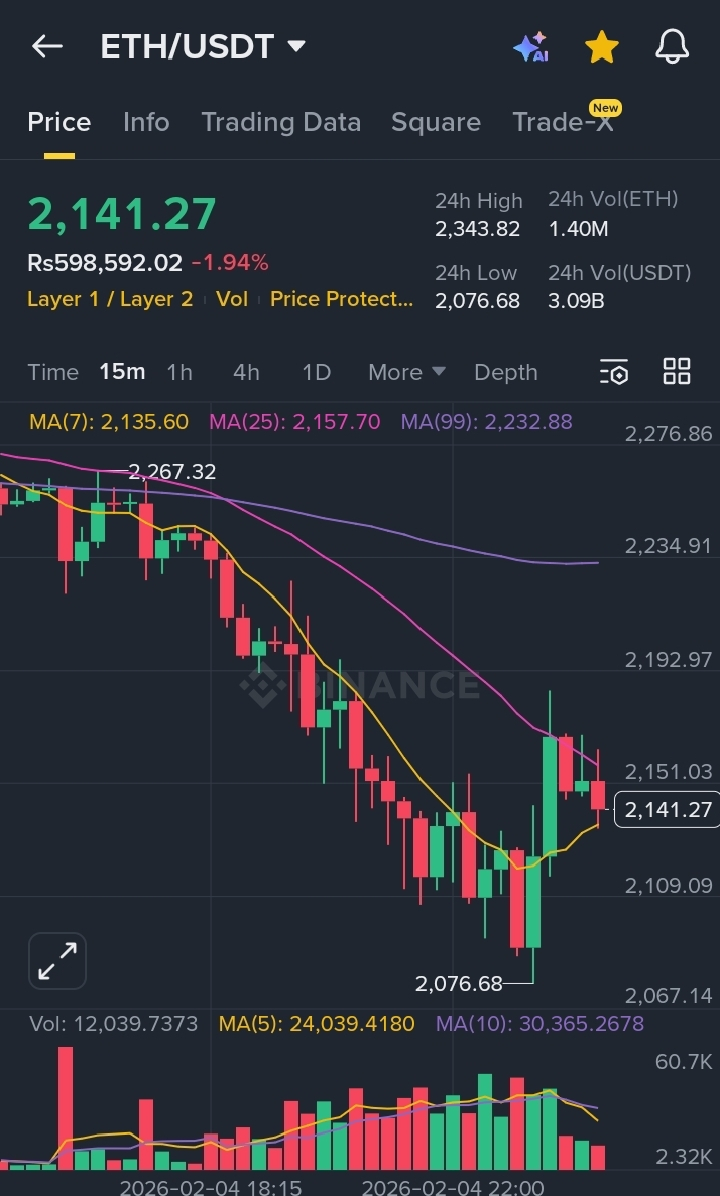 Ethereum a avut o lovitură mai dură decât Bitcoin, tranzacționându-se în prezent la **$2,141**—o scădere de aproape 2% în ultimele 24 de ore. Graficul ETH arată o scădere abruptă de la maximul de $2,343, cu prețul în prezent având dificultăți în a rămâne deasupra suportului psihologic de **$2,100**. O rupere decisivă sub **$2,076** ar putea deschide ușa pentru o alunecare către regiunea **$1,800**, care a acționat ca suport major în mijlocul anului 2025.