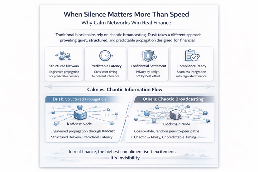 Dusk takes a different stance. It treats message delivery as part of the security model, not an implementation detail. By using structured propagation through Kadcast, the network behaves less like a crowd and more like engineered infrastructure. Messages move with intention. Latency becomes predictable. Bandwidth stays controlled.