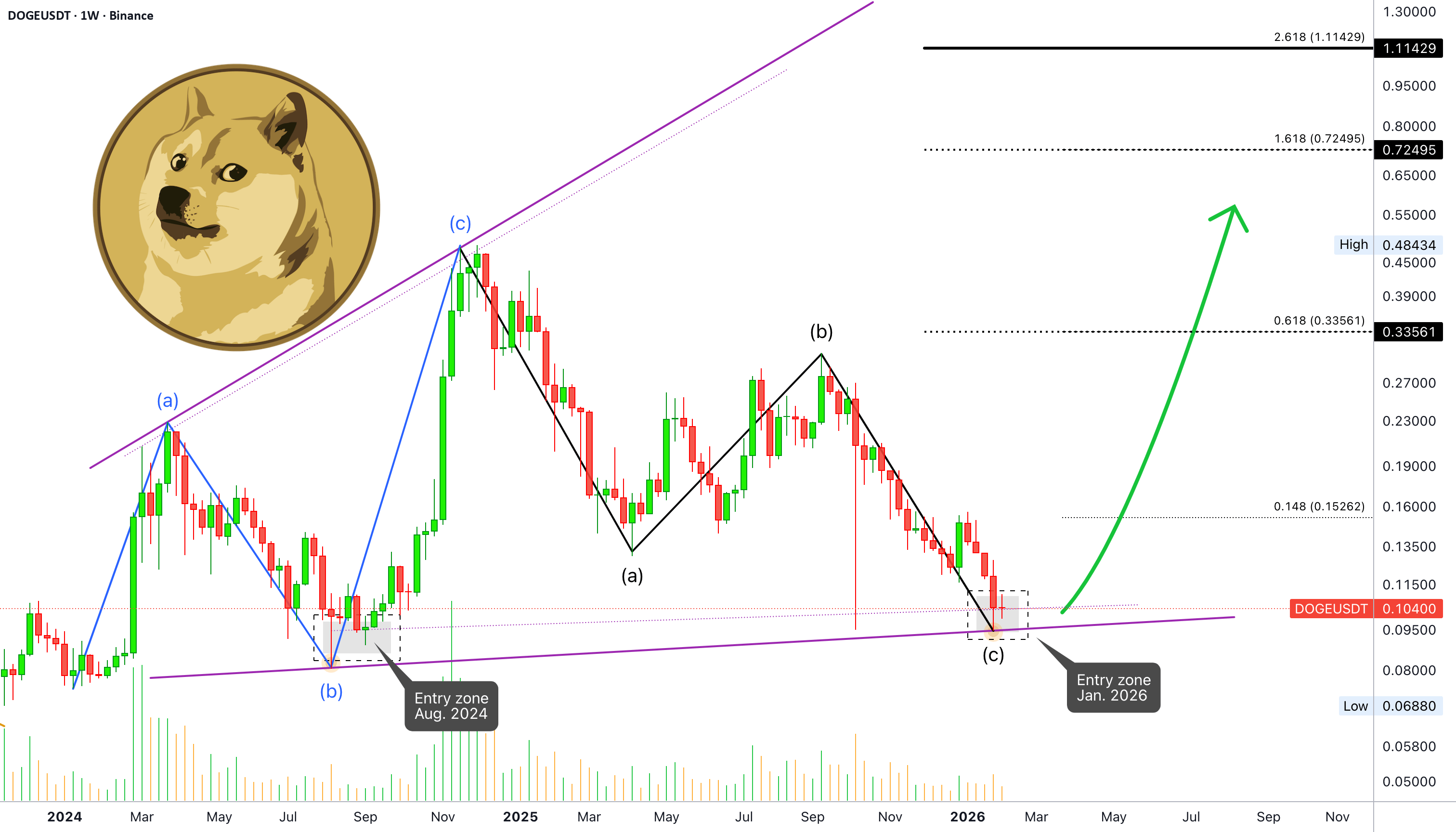 Dogecoin is now trading within a good "entry zone." Bottom prices with support shown as a rising trendline and also the October 2025 flush low.