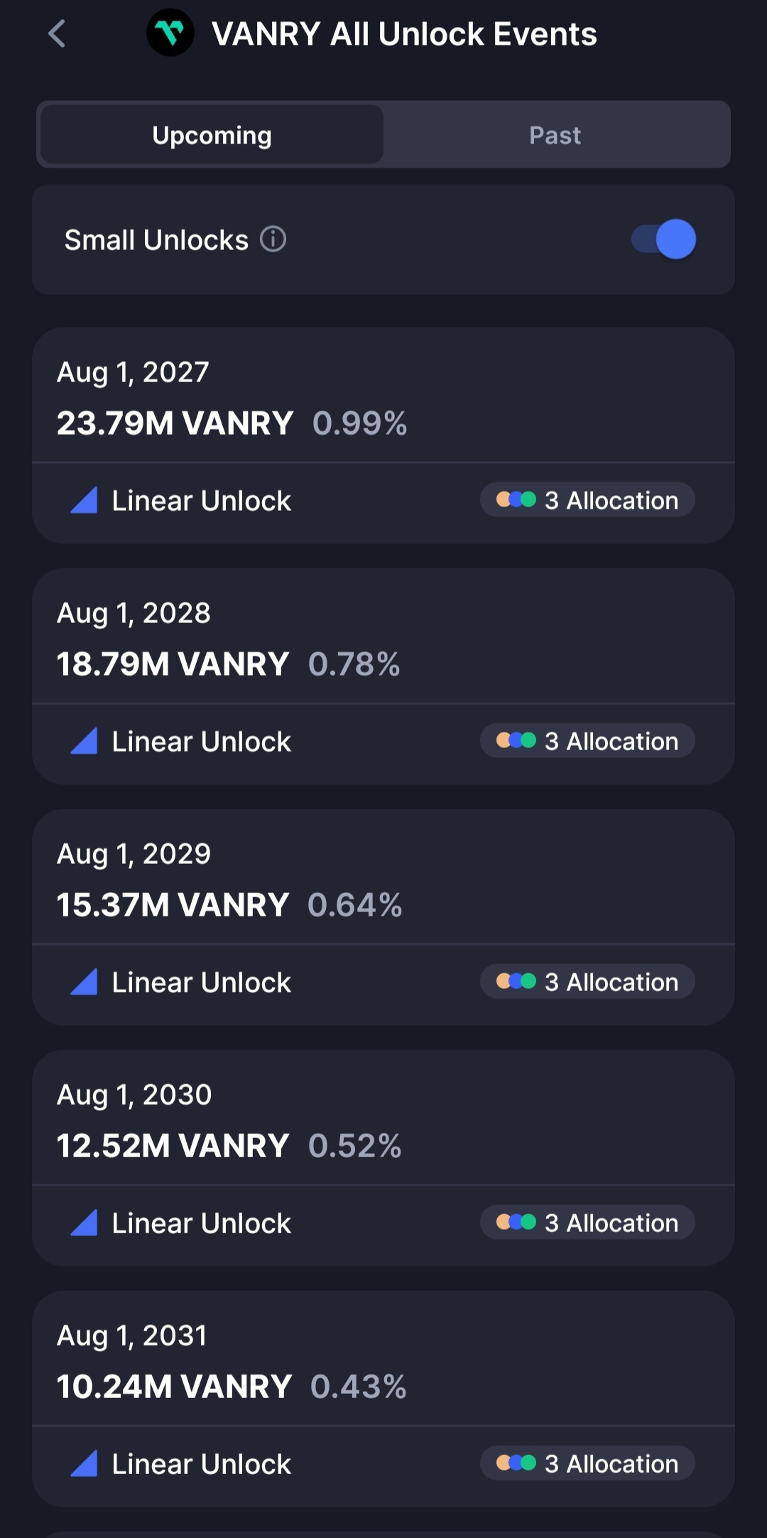 After that, the following year introduced a more moderate injection. On December 1 2024 a total of 203.16 million VANRY unlocked, representing 8.47 percent of supply. This was fully linear and spread across three allocations. By this time Vanar had started to gain real traction through developer interest, new AI centric updates and increasing visibility across platforms. The unlock passed smoothly with no disruptive market impact, showing that supply pressure is manageable when network demand grows in parallel.