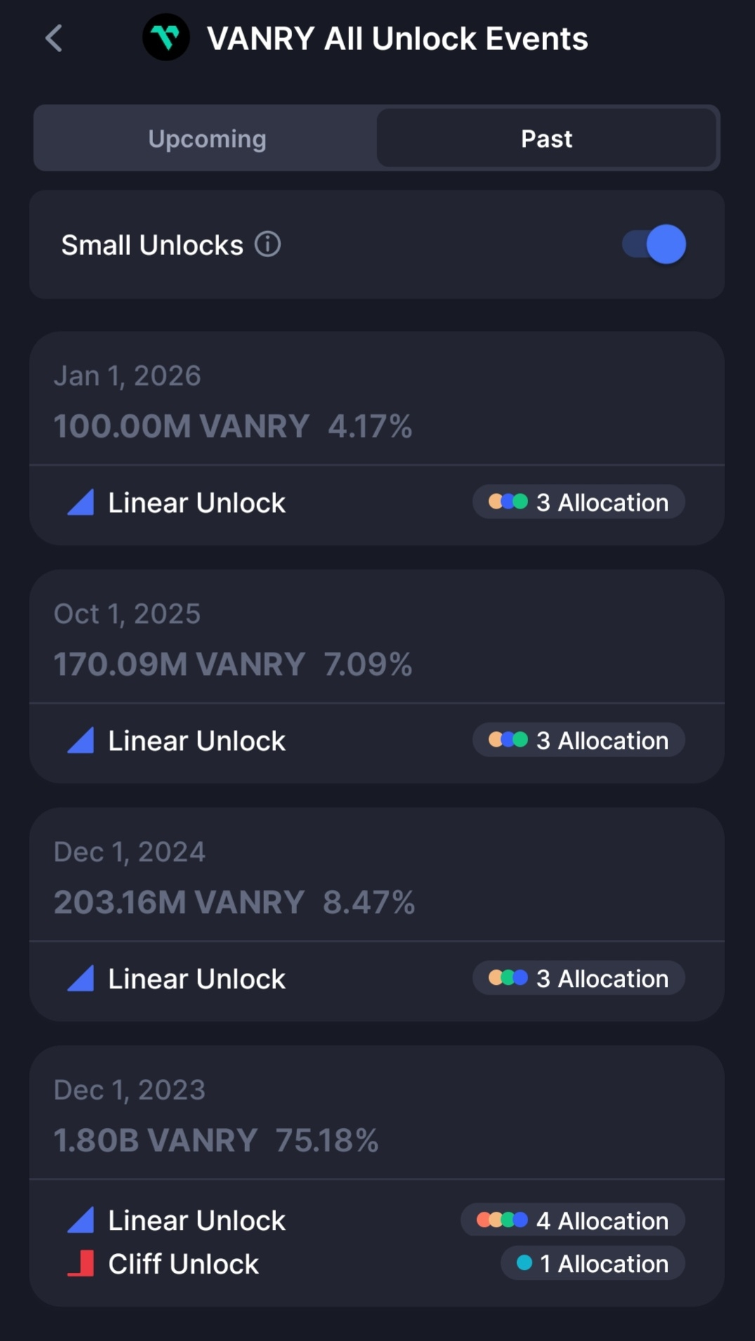 The largest unlock in Vanar’s history already occurred on December 1 2023 when roughly 1.80 billion VANRY entered circulation, accounting for over 75 percent of the total supply at that stage. This early foundational unlock included both linear allocations and a single cliff allocation and marked the initial distribution phase for ecosystem contributors. Although the number was massive, the market absorbed it because Vanar was still in its foundational phase and because early token concentration needed to transition into broader distribution. This was the event that shaped the rest of the supply curve. Once such a large unlock happens early in a project’s life cycle, every unlock afterward becomes significantly smaller and safer.