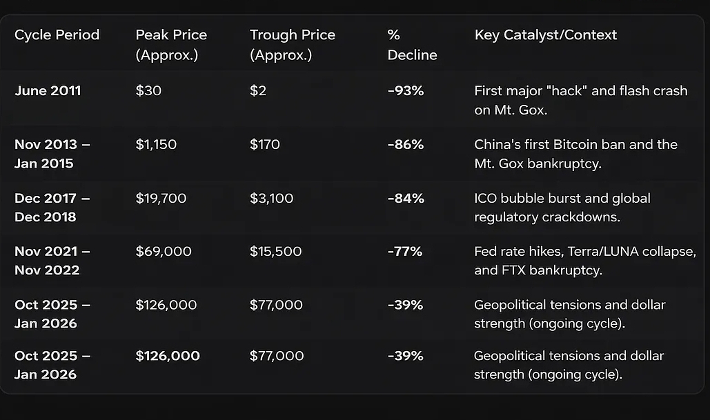 Chiar și în piețele taurice puternice, Bitcoin experimentează frecvent retrageri de 20–40%. Aceste mișcări sunt incomode, dar istoric normale.