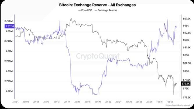 Crypto exchange reserves have risen by 34,000 BTC since mid-January, increasing the near-term supply risk.