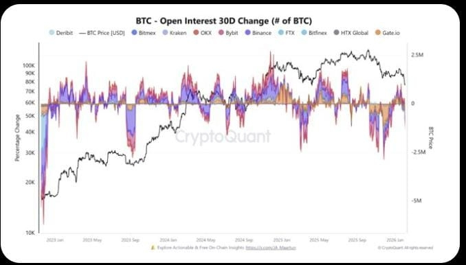 CryptoQuant data noted that Bitcoin’s 30-day open interest change shows a sharp contraction across exchanges, reflecting widespread position closures, not just freshly opened short positions.
