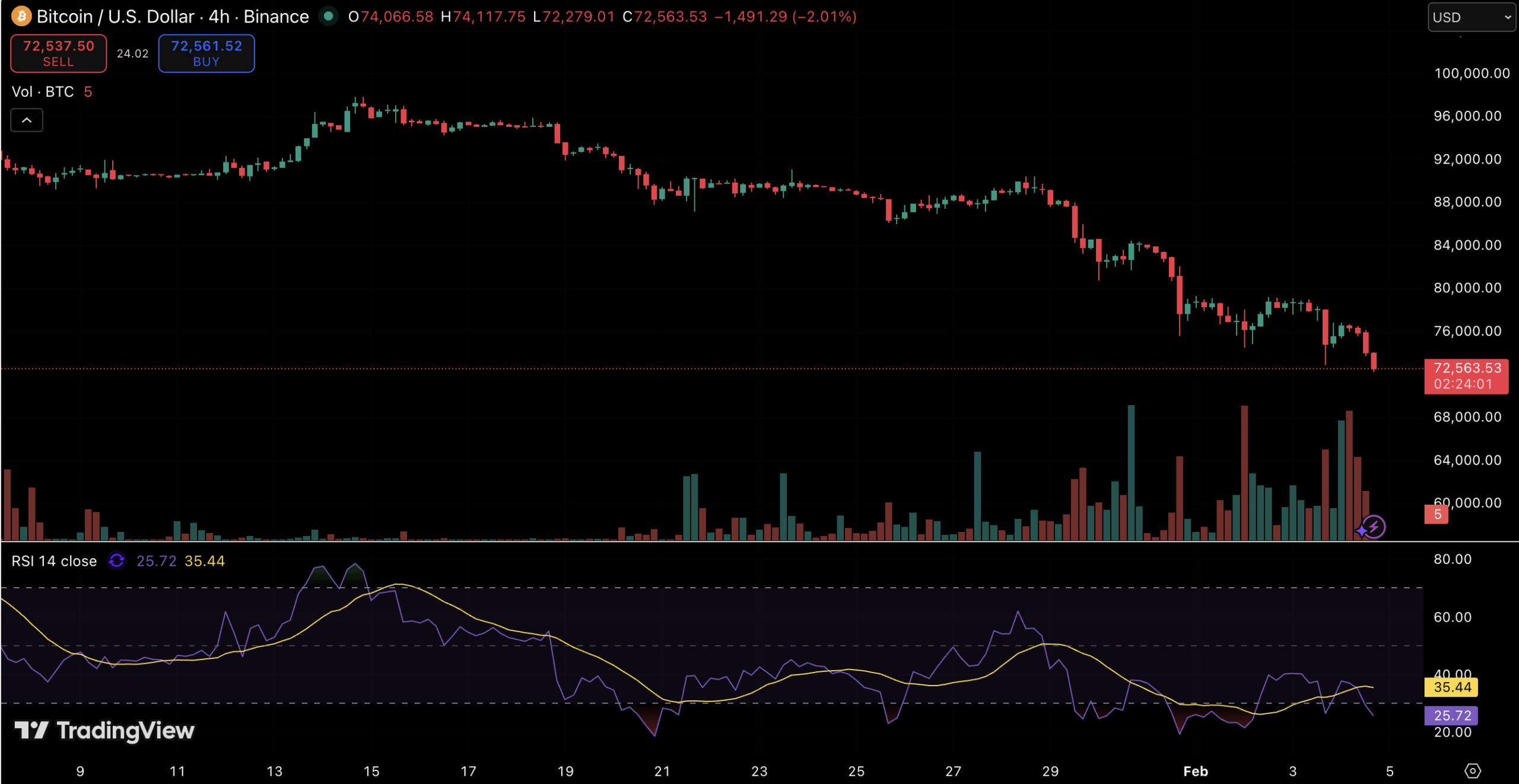 Bitcoin continued its slide, trading near $72,500 after another weak session. The world’s largest cryptocurrency is now down sharply on the week, with buyers struggling to step in as volatility stays elevated and liquidation pressure builds across derivatives markets. This is the lowest level BTC has hit since 2024.