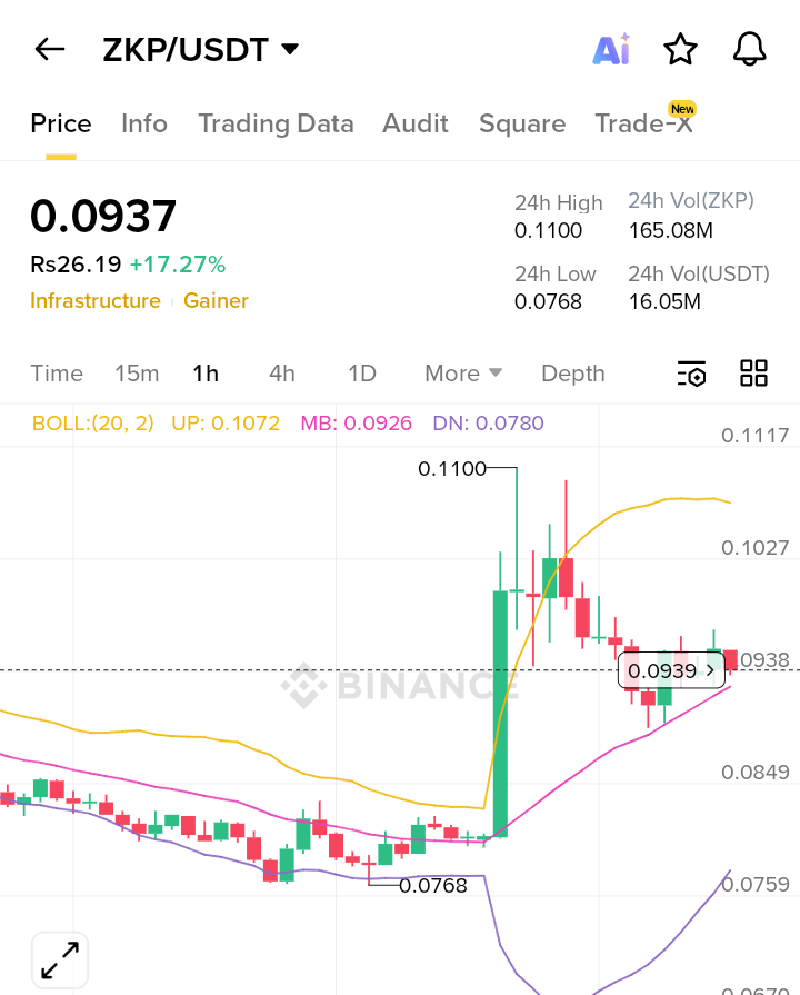 • The recent price pump in $ZKP is the result of a confirmed technical breakout combined with rising trading volume and a shift in short-term market sentiment. On the 1-hour timeframe, $ZKP broke out from a prolonged consolidation range around the $0.076–$0.078 zone, which previously acted as a strong accumulation area. This breakout was supported by a high-volume bullish candle, indicating genuine buying pressure rather than a temporary spike. Once price reclaimed the psychological $0.09 level and moved above the Bollinger Band midline, momentum traders entered aggressively, accelerating the upside move.