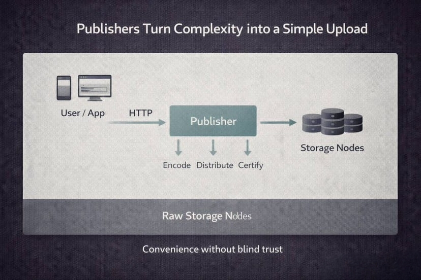 In Walrus, a publisher is basically a professional uploader. Instead of forcing every app to manage fragmenting data and talking to storage nodes directly, a publisher can accept data over standard web methods like HTTP. The data can be encrypted, split, distributed to nodes, and turned into an on chain certificate by the publisher.