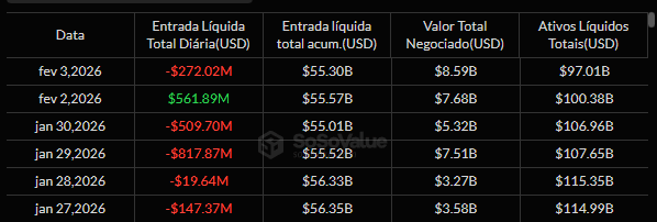 O final de Janeiro: Entre os dias 27/01 e 30/01, vimos uma saída líquida pesada, totalizando aproximadamente US$ 1,49 bilhão. Esse movimento preparou o terreno pra correção técnica que estamos tendo agora.