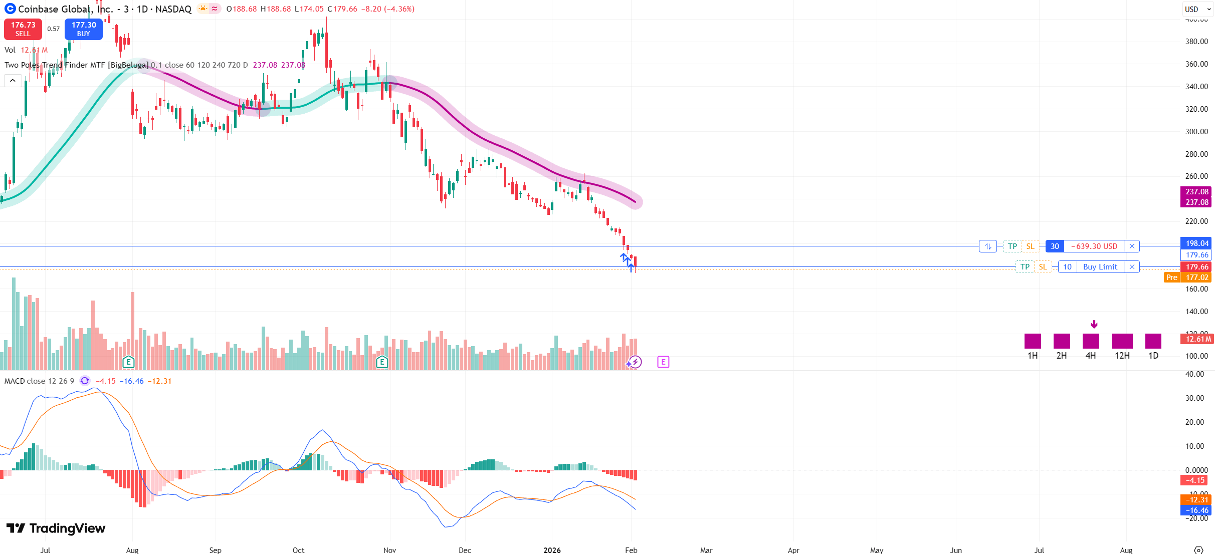 截至2026年2月4日晚21:40,COIN盘前价格179.66美元,较前收变动 -4.34%。