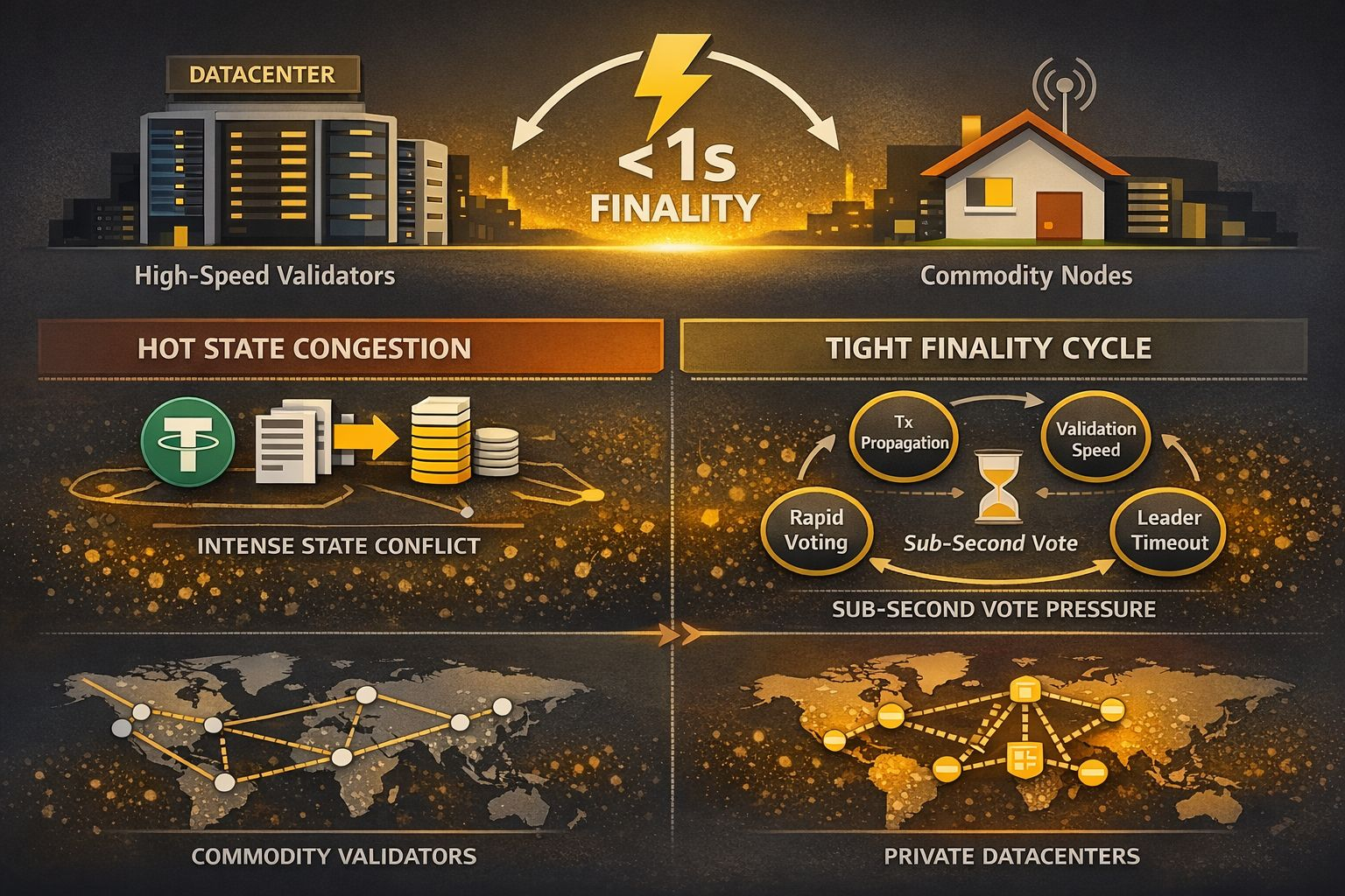 That’s where the trade-off shows up. When finality targets are aggressive, the network’s tolerance for variance collapses. A few validators with slower disks, weaker CPUs, worse mempools, or simply longer network paths don’t just lag quietly; they become the constraint that forces everyone else to either wait or risk safety assumptions. In classic blockchain marketing, decentralization is treated like a social property. In high-frequency settlement, decentralization turns into a latency distribution problem. The tail matters. You can have a thousand validators, but if a meaningful slice sits behind consumer-grade connectivity or modest hardware, sub-second finality becomes a best-case claim, not a system guarantee.