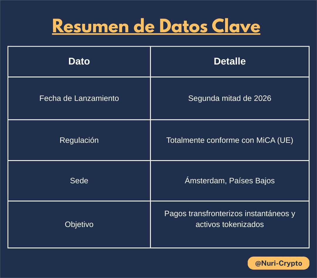 Qivalis no es solo un proyecto tecnológico; es una joint venture con sede en Ámsterdam que actúa como una "fábrica" de dinero digital regulado. Su objetivo es lanzar un euro digital privado (una stablecoin) en la segunda mitad de 2026.