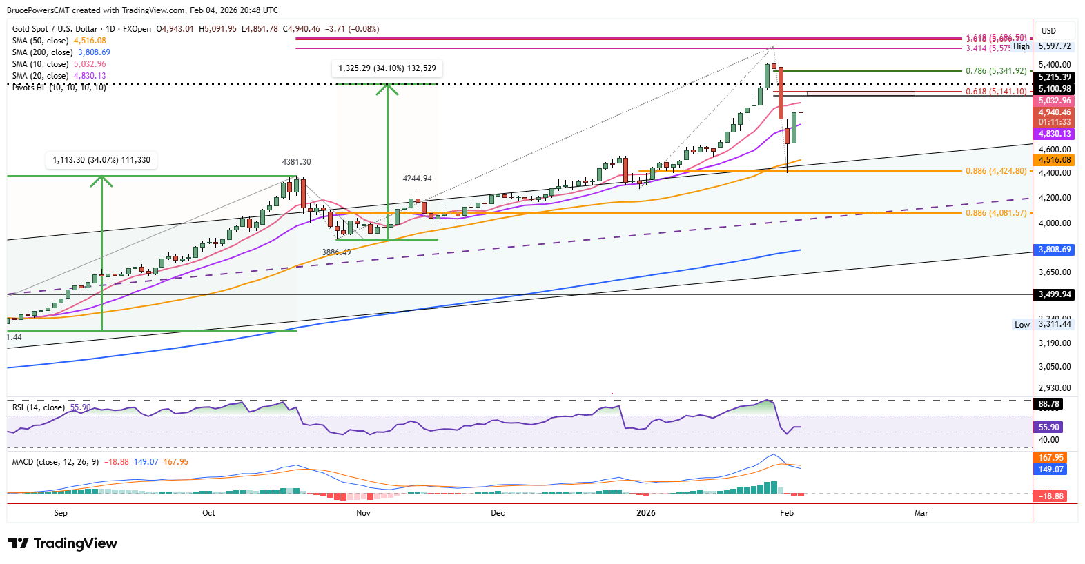 Range-Bound Trading: Price action is currently contained within a wide range of $4,402 to $5,598, indicating choppy conditions. Moves within this range may not follow typical patterns.