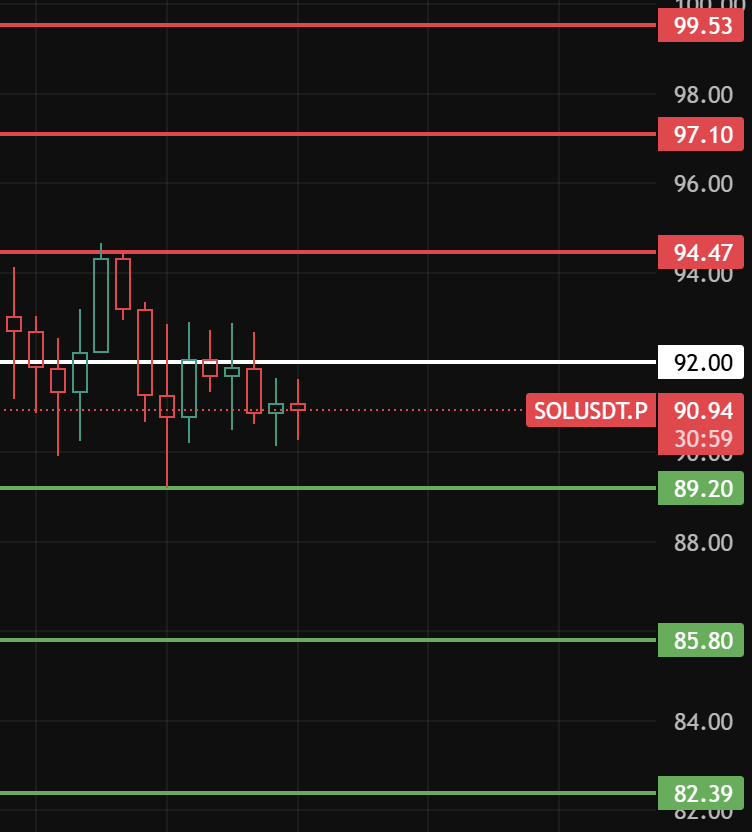 SOL今天留意92这个位置,只有站稳此位置上方1小时级别才开始反弹,上方压力位留意94-97-99这几个位置附近!