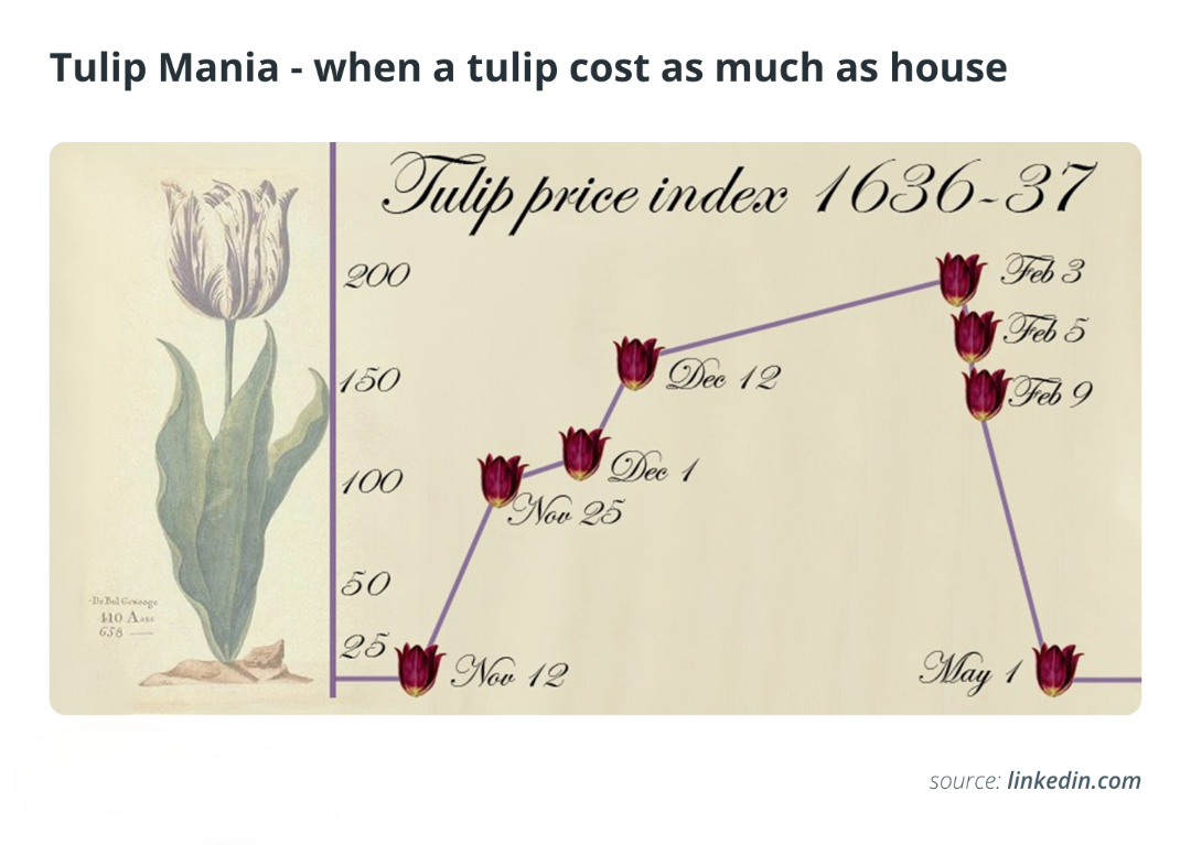 Ever heard of “Tulip Mania?” In the early 17th century, tulip bulbs reached extraordinarily high prices before the market dramatically collapsed, becoming a symbol of speculative bubbles.