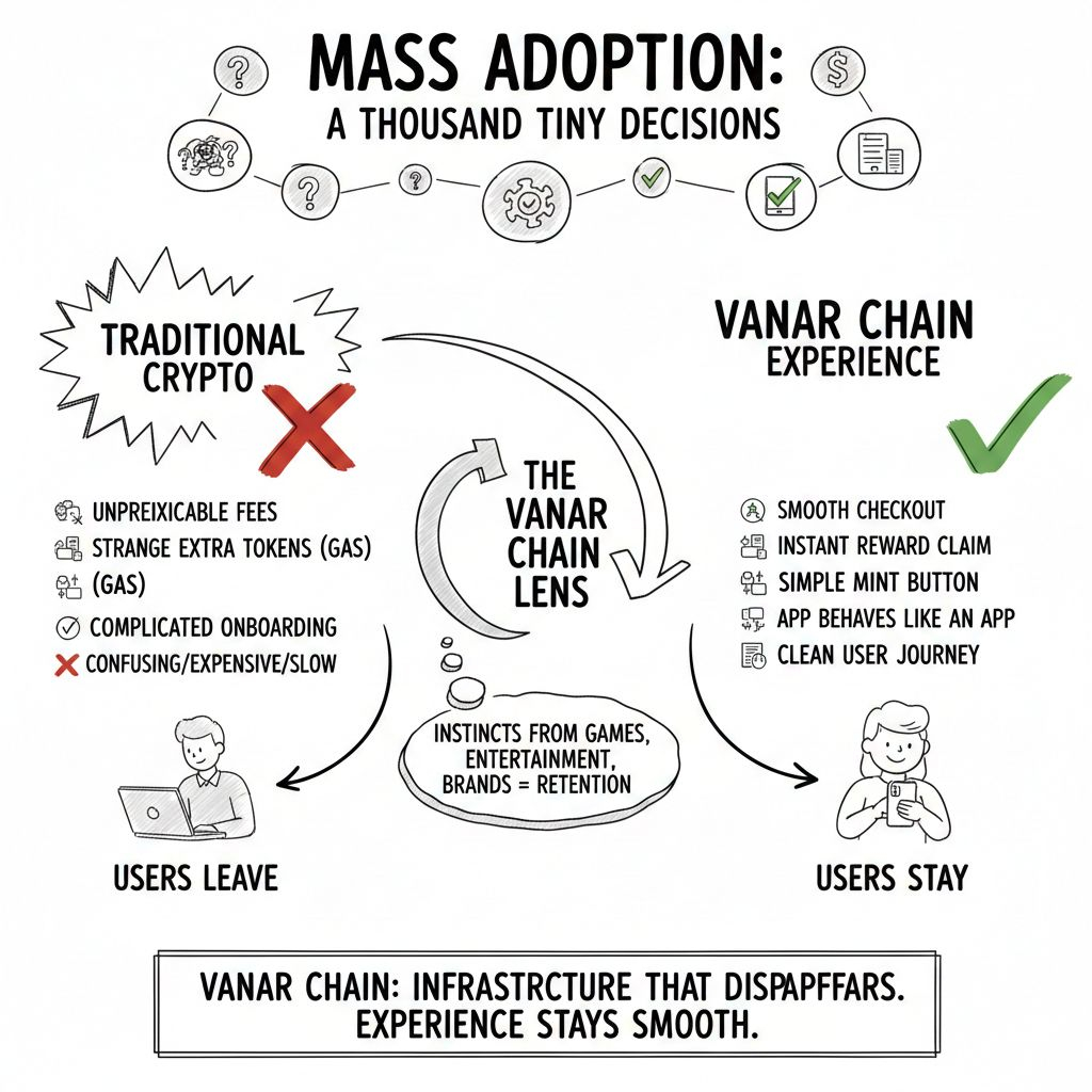 People talk about “mass adoption” like it’s a wave that suddenly hits. I think it’s more like a thousand tiny decisions where someone chooses not to leave. The checkout doesn’t hang. The reward claim feels instant. The mint button doesn’t look like a gamble. The app behaves like an app, not like a science project. That’s the lens I use for Vanar Chain. It isn’t trying to win a popularity contest with buzzwords. It’s trying to become the kind of infrastructure that disappears in the background while the experience stays smooth.