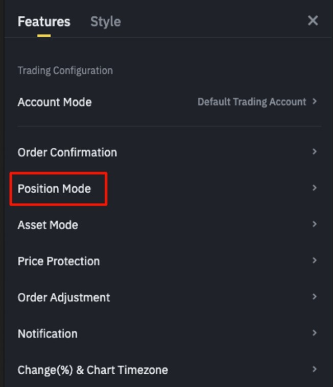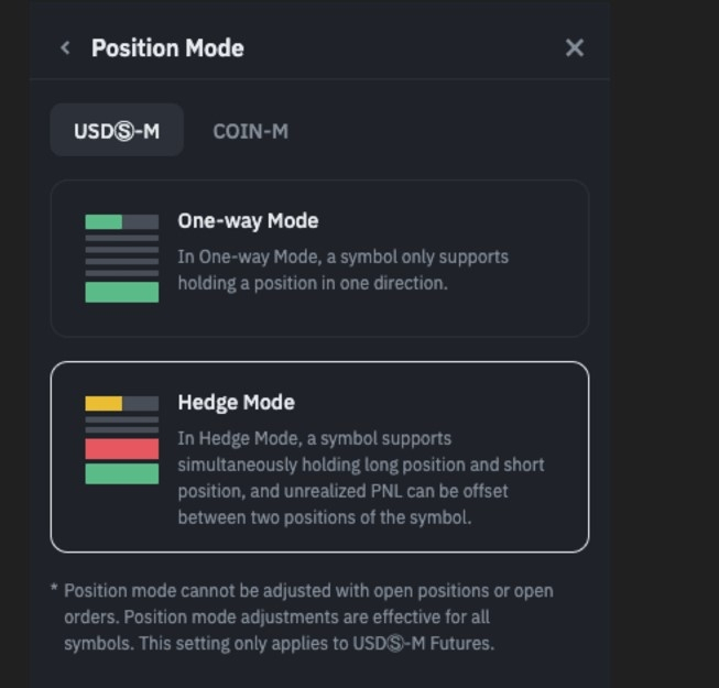 Please note that Position Mode cannot be adjusted while you have open positions or open orders.