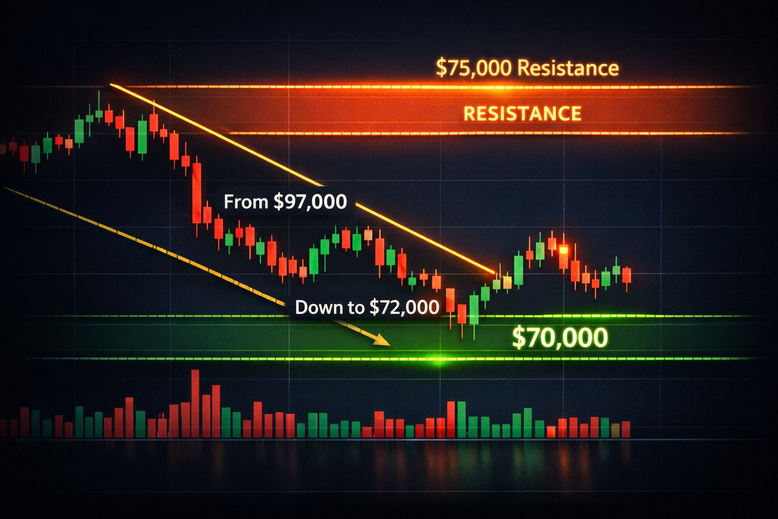 يشير التحليل إلى أن بيتكوين تمر حاليًا بمرحلة حساسة بعد تراجع ملحوظ في السعر. فقد انخفضت العملة بنحو 26% خلال ثلاثة أسابيع، من حوالي 97,400 دولار إلى قرابة 72,000 دولار. هذا التصحيح أعاد السعر إلى منطقة دعم مهمة قد تحدد اتجاه السوق على المدى القريب والمتوسط.
