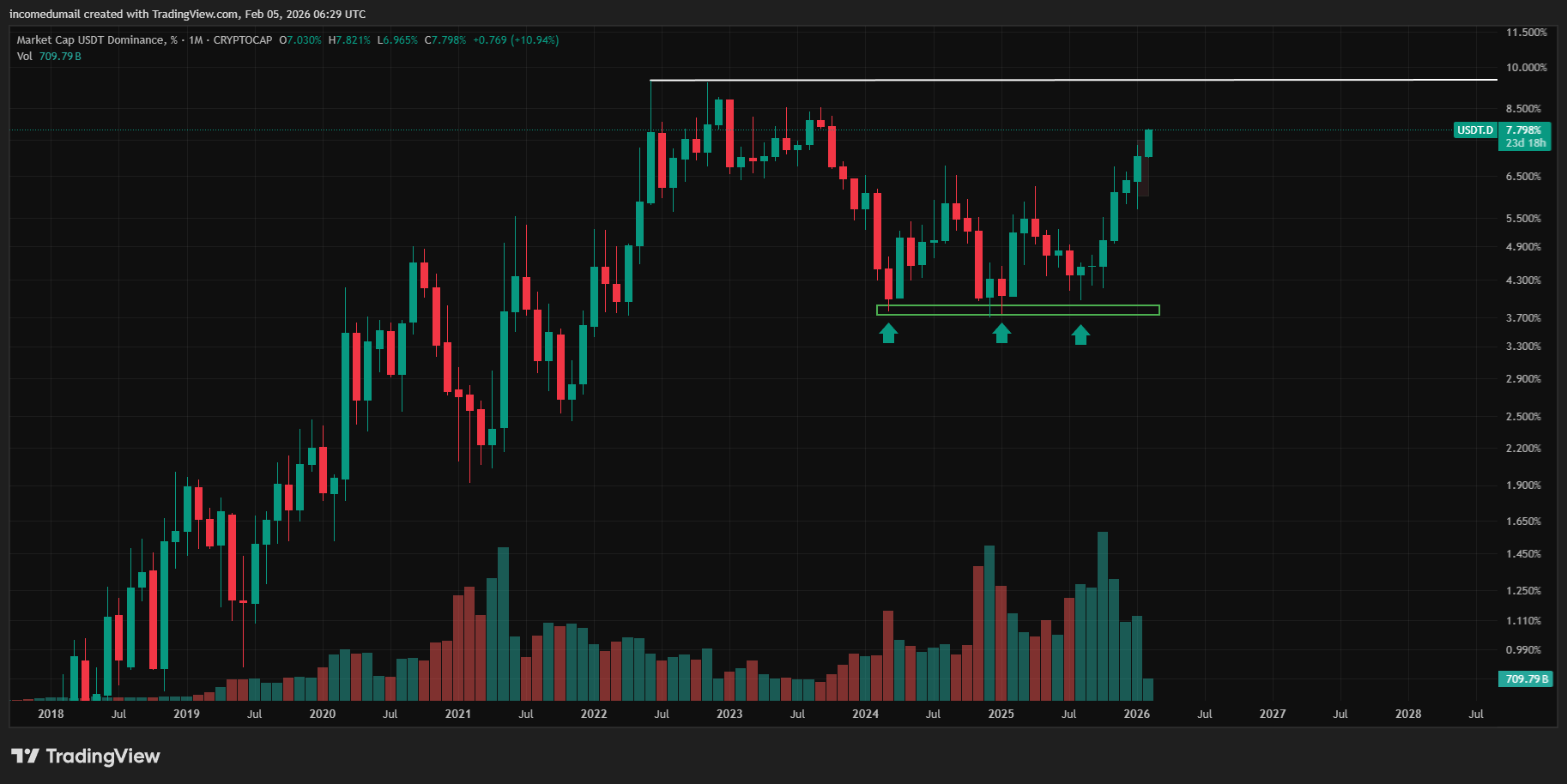 Higher dominance = capital sitting in USDT rather than risk assets.