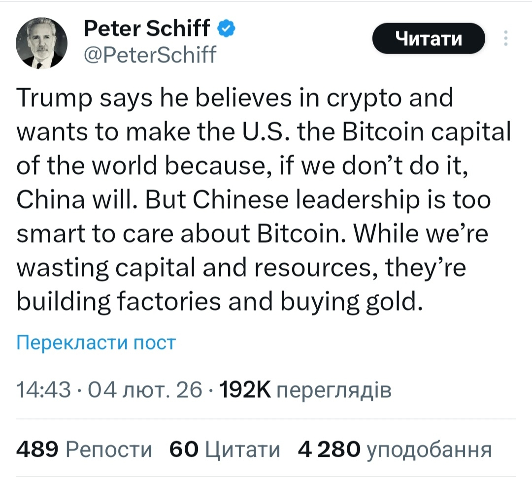 Навіть більше, він заявив що Китай занадто розумний для біткоїна. За його словами, Америка майнує ресурси на BTC в той час я Китай будує заводи та скуповує золото.🤷♂️