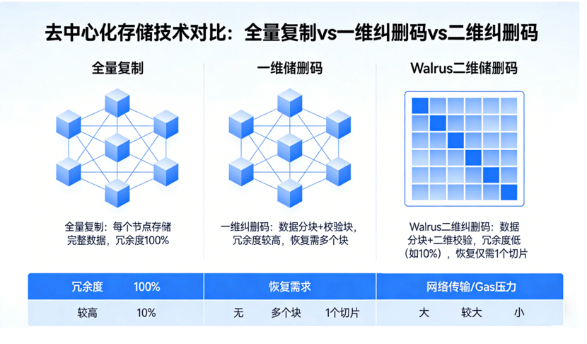 再看存储底层的Red Stuff技术,这是Walrus降本的另一大底气。传统去中心化存储要么靠全量复制保安全,冗余太高导致Gas和存储成本飙升;要么用一维纠删码,恢复数据时要下载大量内容,反而增加了网络开销和Gas消耗。而Walrus的二维纠删码,既能用极少的冗余实现高安全性,恢复数据时只需要下载一个切片,大幅减少网络传输,间接降低Gas压力。