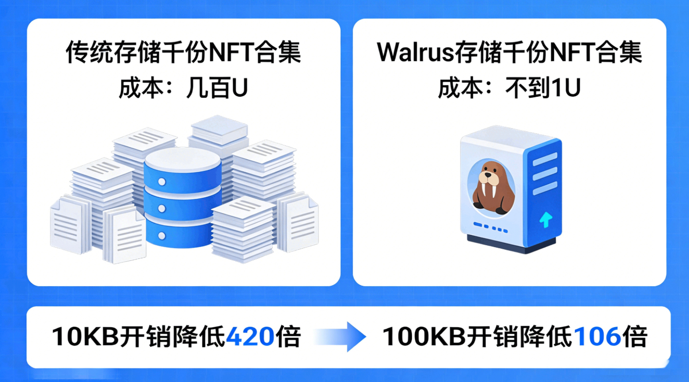 比如很多NFT元数据都是10KB左右的小文件,用传统存储方案,每个文件要单独支付Gas,冗余备份还会额外增加开销,一个千份NFT合集的存储Gas费可能就要几百U。但用Walrus的Quilt方案,会把这些小文件打包成一个单元集体处理,不用单独为每个文件付Gas。