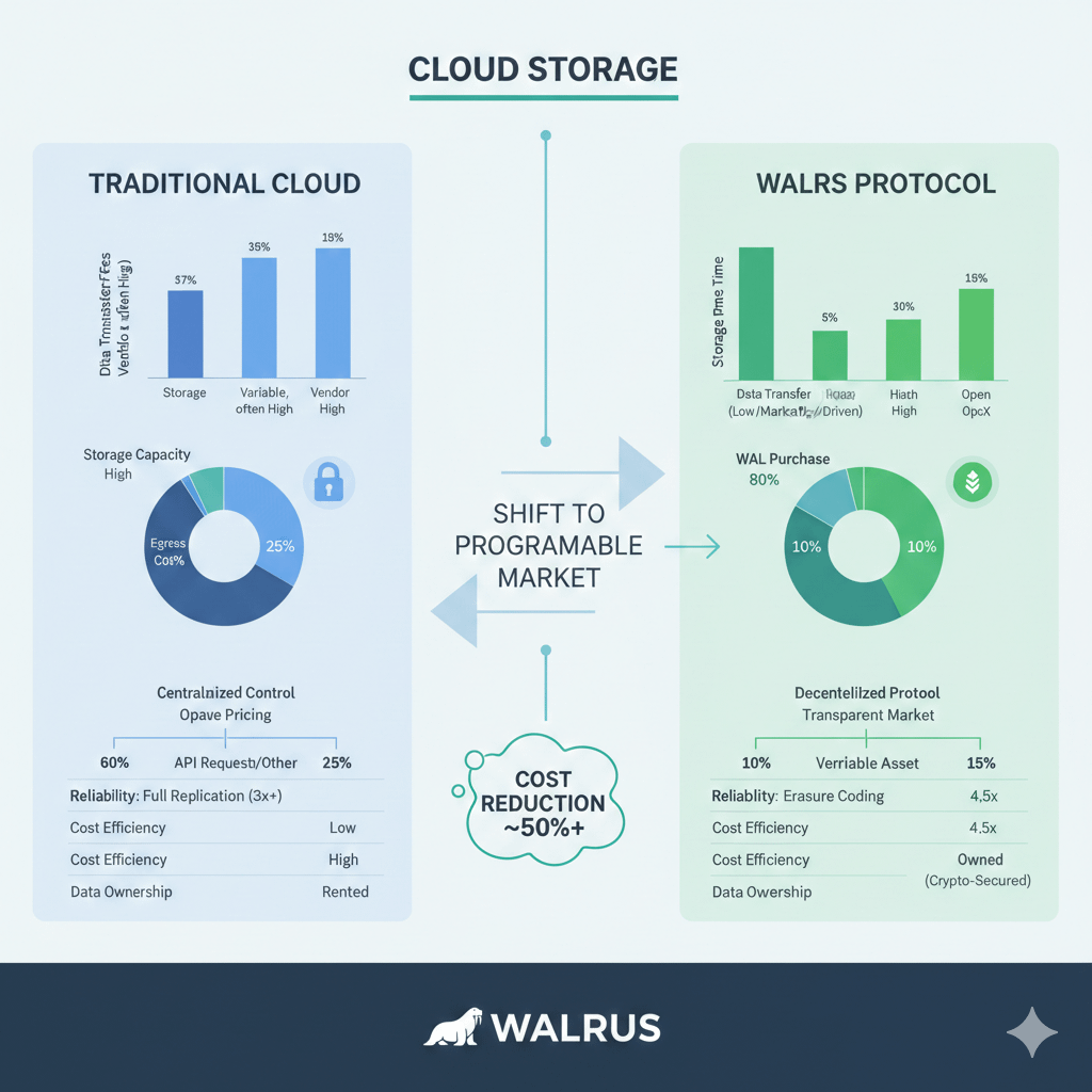 Traditional cloud platforms rely on centralized control over both infrastructure and pricing. Users are billed for storage capacity network egress API requests and redundancy often with cost structures that are difficult to predict at scale. High transfer fees alone have become a major friction point discouraging data mobility and reinforcing platform lock-in. Once data is deeply embedded in a provider’s ecosystem migrating away becomes expensive and operationally complex. Walrus addresses this imbalance by designing storage as a protocol rather than a service removing the structural incentives that trap users within closed systems.