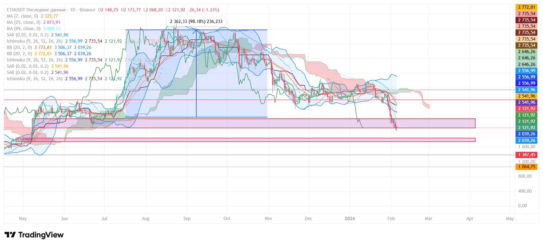 Цена находится ниже ключевых EMA (7/25/99), что подтверждает среднесрочную медвежью структуру. Облако Ишимоку развернулось вниз, и цена торгуется под облаком — это признак доминирования продавцов. Полосы Боллинджера расширяются вниз, что указывает на усиление импульса. При этом формируется локальная зона спроса в диапазоне 2050–2150$, где ранее активно заходил объём.