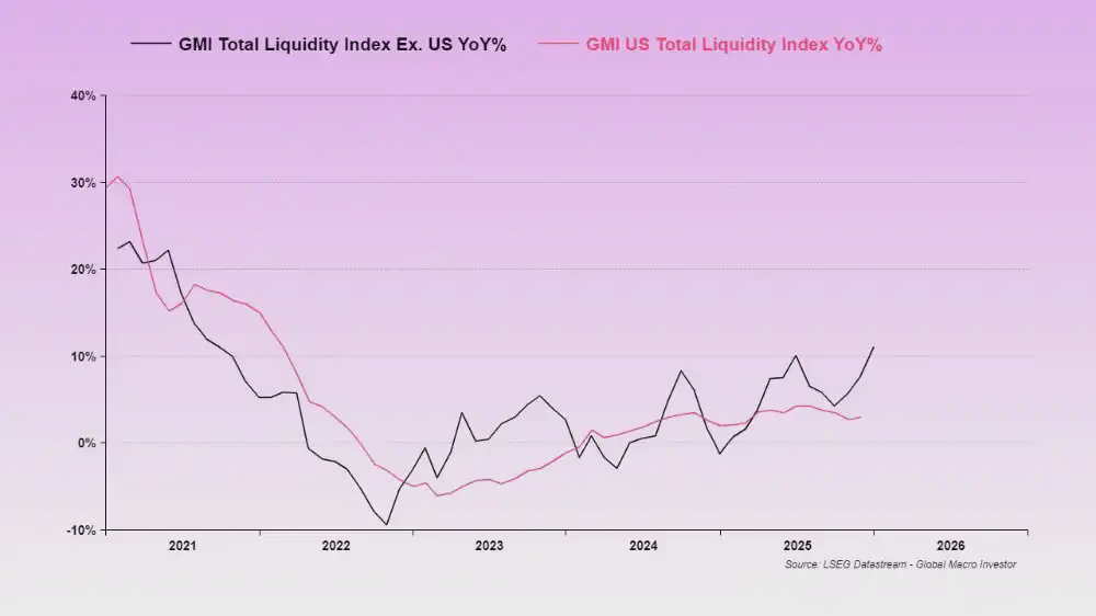 但在当前这个阶段,美国总流动性(US Total Liquidity)显然更具主导性——因为美国仍然是全球流动性的核心供给方。