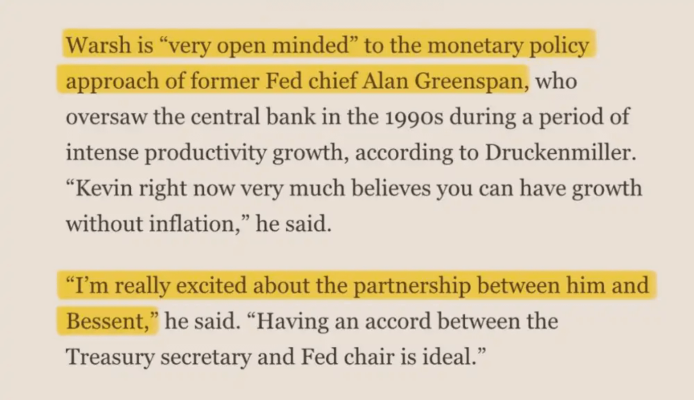 与此同时,围绕货币政策的「错误叙事」同样值得警惕。市场普遍将 Kevin Warsh 视为鹰派,但来自德鲁肯米勒的表态显示,其政策思路更接近格林斯潘时代:容许经济偏热运行,并押注生产率提升来缓解通胀。在这一框架下,未来更可能出现的是降息与财政端协同释放流动性。