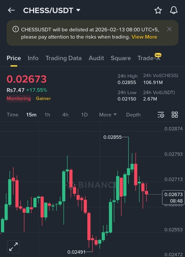 The announcement that $CHESS/USDT will be delisted on February 13, 2026, has triggered a sudden surge in price. While a delisting is fundamentally bearish, the market is currently reacting with a "Dead Cat Bounce" or a speculative pump.