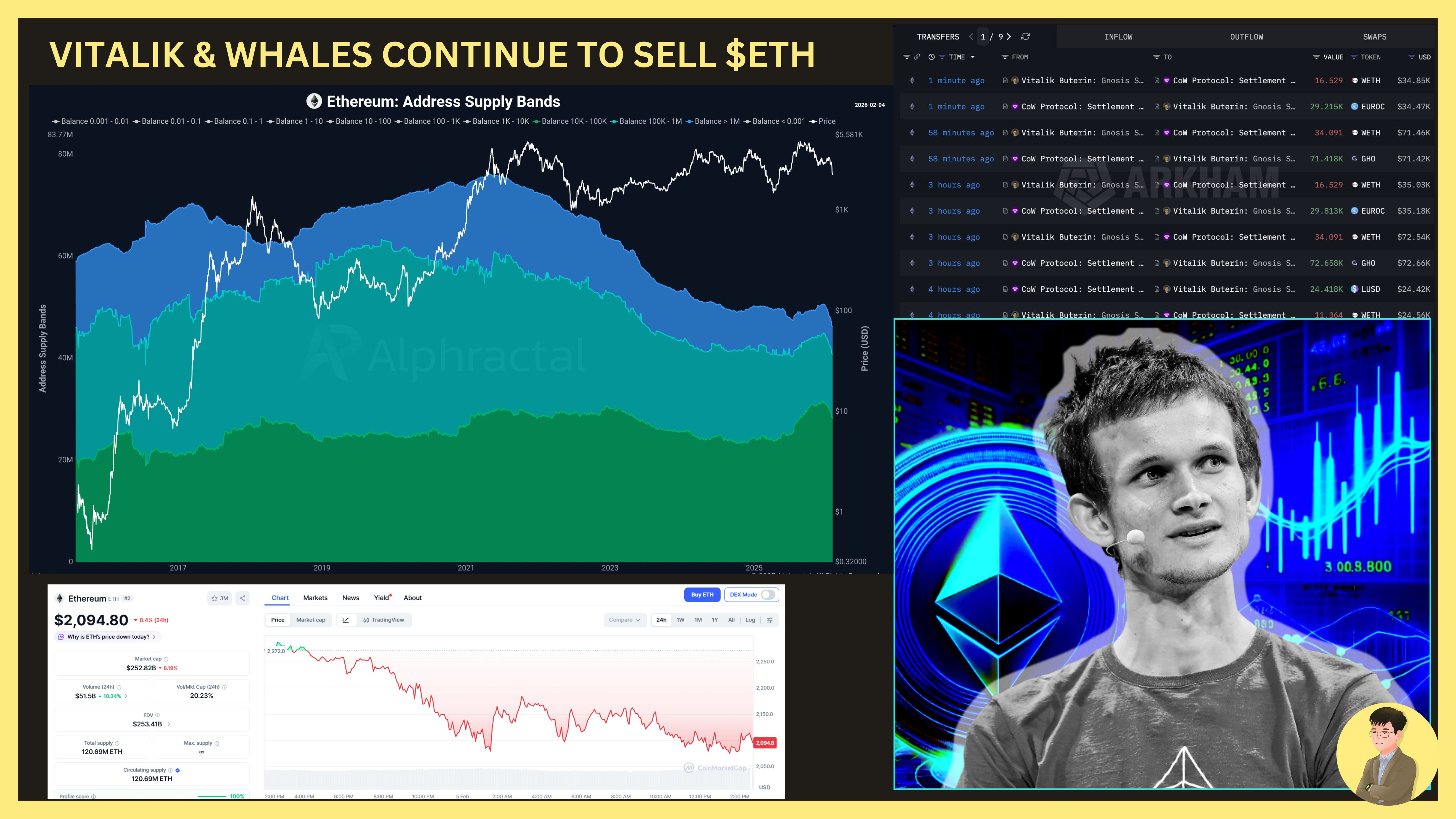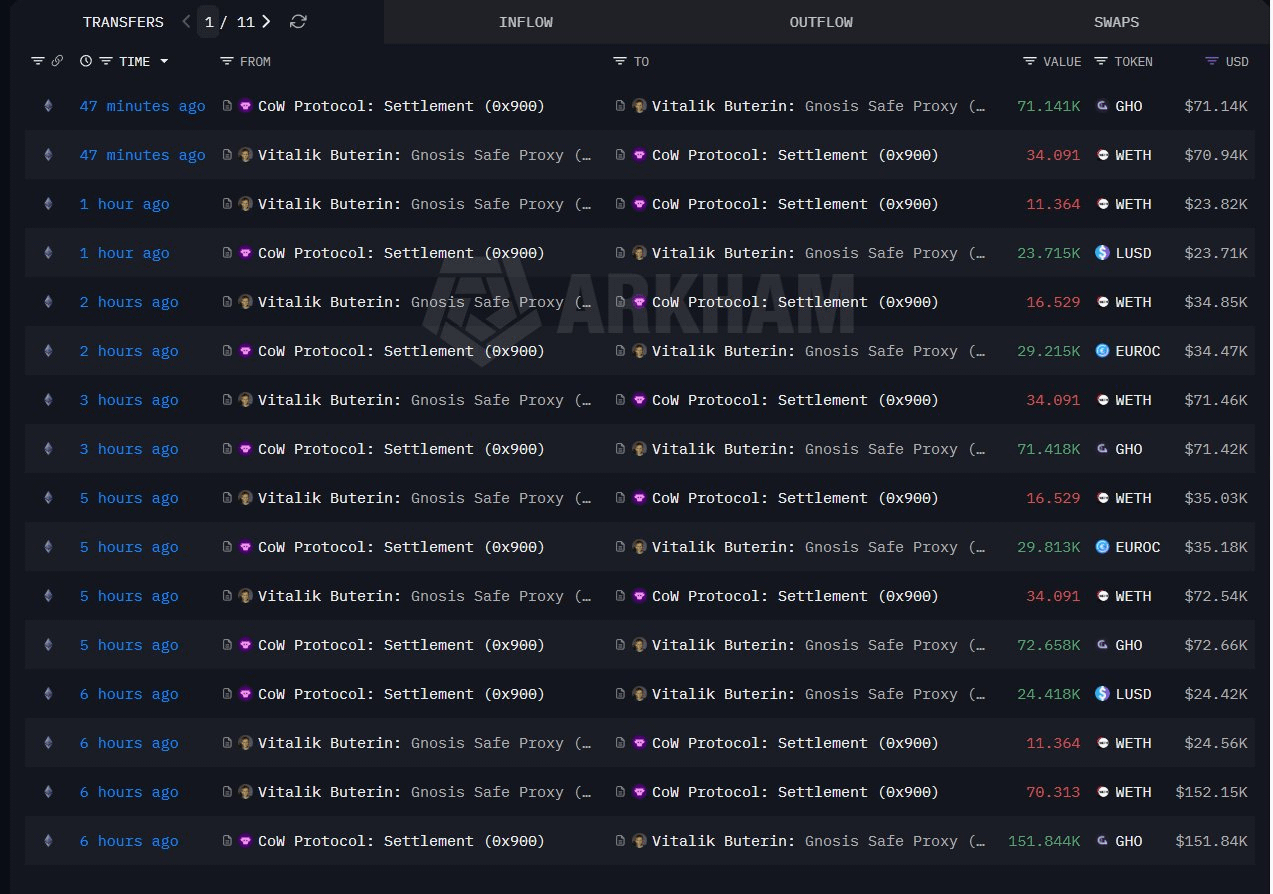- Trong 3 ngày gần nhất (03/02 - 05/02): Vitalik đã bán khoảng 2.779 - 2.961 $ETH , thu về 6,2 - 6,6 triệu USD (giá trung bình 2.228 - 2.238 USD/ETH). Chuyển đổi sang các stablecoin như USDC, GHO, EUROC và LUSD
