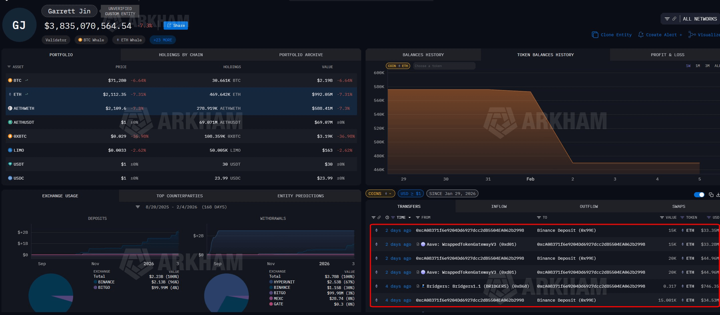 - Thực hiện chuyển dịch khối lượng lớn với hơn 100.000 ETH (~250 triệu USD) lên sàn Binance ngay đầu tháng 2.