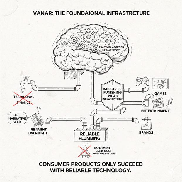 Vanar feels like one of those projects that started with a very practical instinct about how real adoption happens, because it did not begin by trying to win the DeFi narrative war or by promising to reinvent finance overnight, but by aiming directly at the kinds of industries that punish weak infrastructure immediately, which is exactly why the early emphasis on games, entertainment, and brands still matters even if the buzzwords around those sectors rise and fall, because consumer products only succeed when the technology underneath them behaves like reliable plumbing rather than an experiment that constantly asks users to understand it.