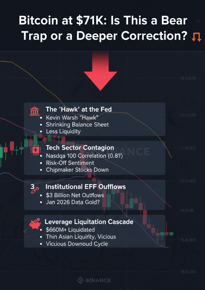 Forced Selling: As BTC drifted below key support levels ($75k and $72k), it triggered a wave of liquidations for over-leveraged long positions. Over $660 million in positions were liquidated recently, creating a "vicious cycle" of downward pressure.