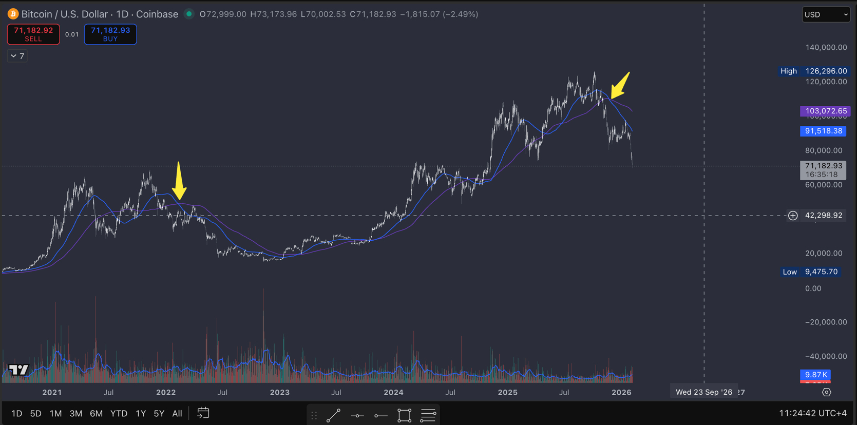 Back in 2021, when Bitcoin lost both the 100-day and 200-day EMAs, that’s when the real bear market began. This time, in November 2025, price lost both again. Since then, it’s been a mess.