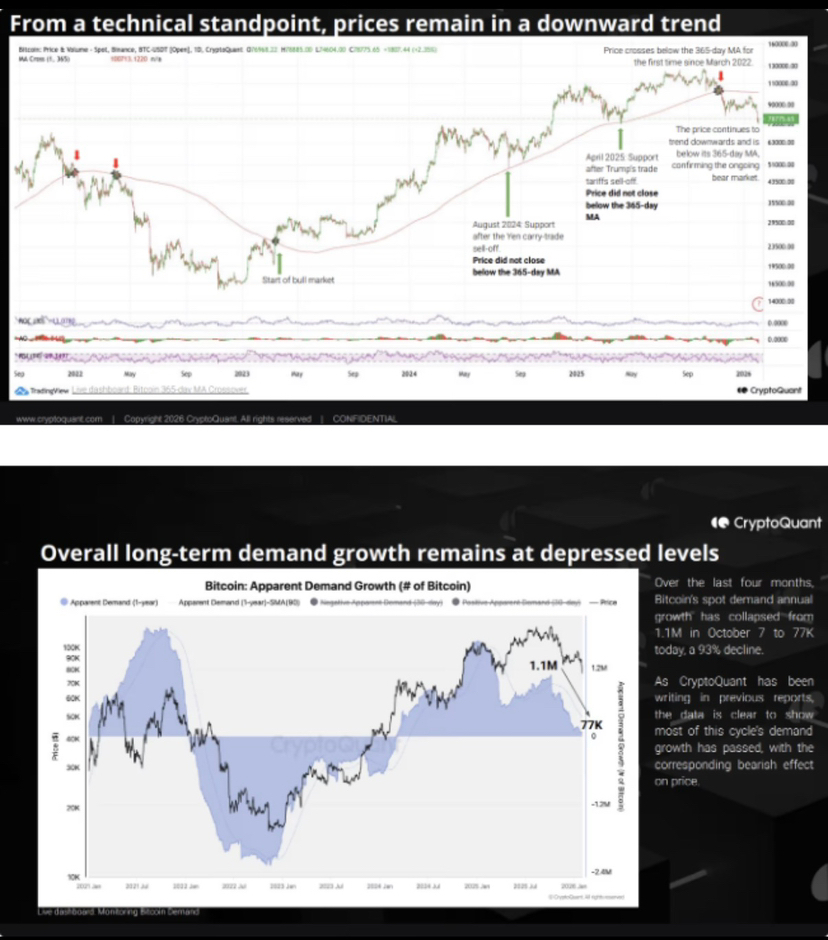 长期来看,明显的需求增长也从去年的高点崩溃,这表明这不仅仅是杠杆被冲走,而是参与度本身在减弱。技术层面上,比特币仍低于其365日移动平均线,链上估值区间主要支撑位于7万美元至6万美元走廊。