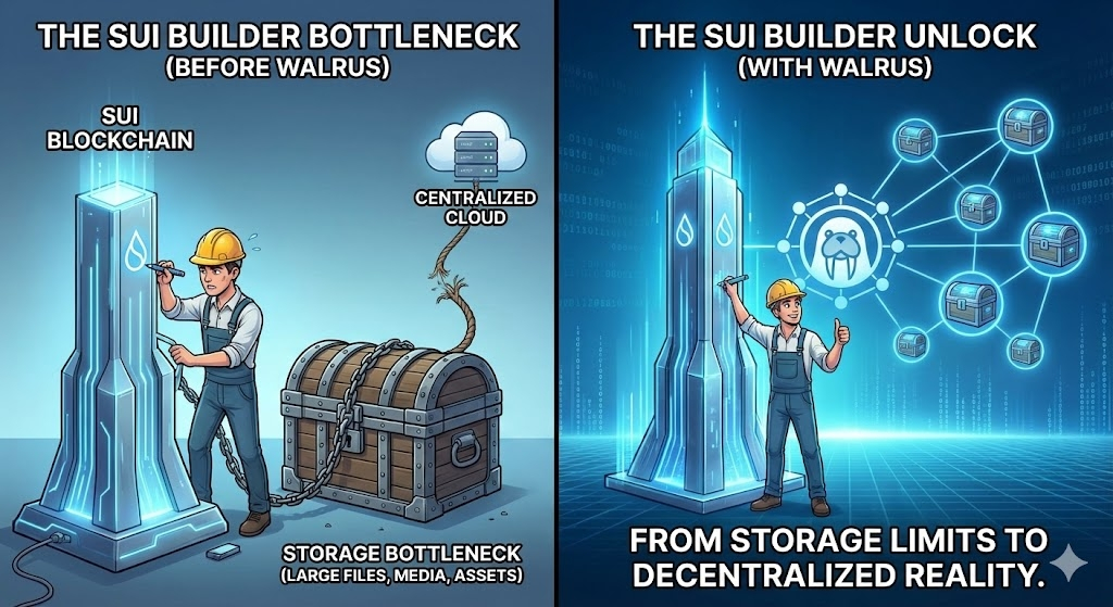 You could build fast smart contracts, parallelize transactions, and onboard users — but the moment your app needed real data, you hit the wall. Images, videos, game assets, social graphs… all quietly pushed back to centralized clouds.