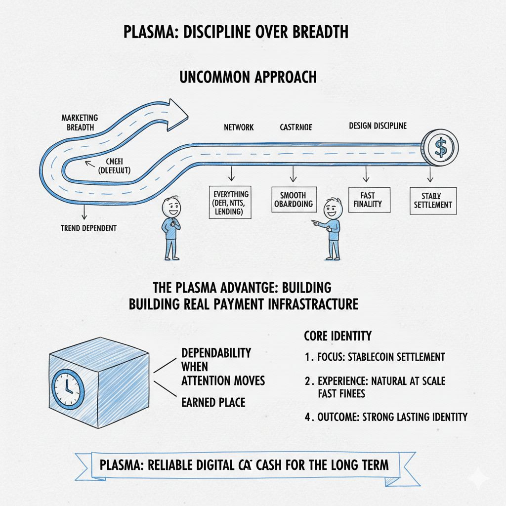 is that Plasma is taking the uncommon approach of choosing discipline over breadth, because it is easier to market a chain that claims to support everything, but it is harder and more valuable to design around one high impact behavior and push that experience until it feels natural at scale, and if Plasma continues to focus on stablecoin settlement with smooth onboarding, fast finality, and stable fee behavior, then the project can carve out a strong identity that does not depend on trends, since real payment infrastructure earns its place by staying dependable when attention moves elsewhere.
